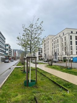 Freiburg liegt in einer der wärmsten Regionen in Deutschland und hat in den vergangenen 30 Jahren die sogenannten heißen Tagen, an denen die Temperatur höher ist als 30°C, von 7 auf 20 Tage fast verdreifacht. Dies kann zu gesundheitlichen Problemen führen, insbesondere für vulnerable Bevölkerungsgruppen. Die Stadt Freiburg hat darum das „Klimaanpassungskonzept Handlungsfeld Hitze“ entwickelt, ein strategisches Planungsinstrument, das darauf abzielt, die Stadt widerstandsfähiger gegenüber extremer Hitze zu machen. Zuerst werden die Stadtteile identifiziert, die besonders von Hitzetagen oder Tropennächten betroffen sind. Dort werden besonders die dicht bebauten Bereiche und die versiegelten Flächen unter die Lupe genommen, um dann Maßnahmen zur Klimaanpassung zu ergreifen: Erhaltung und Schaffung von Grünflächen, Verschattung von öffentlichem Raum, Beachtung der Kaltluftleitbahnen, die frische Luft aus dem Schwarzwald in die Stadt transportieren (zum Beispiel der Höllentäler) und besonders wichtig – Flächenentsiegelung, damit Wasser versickern und der natürliche Wasserkreislauf wieder hergestellt werden kann. Die letztgenannte Maßnahme gehört zum Konzept der Schwammstädte, deren Grundprinzip darin besteht, Elemente zu schaffen, die Regenwasser im Boden aufnehmen und speichern können. Dadurch wird das Risiko von Überschwemmungen verringert, und die Verdunstung des gespeicherten Wassers hilft, Hitze zu bekämpfen.