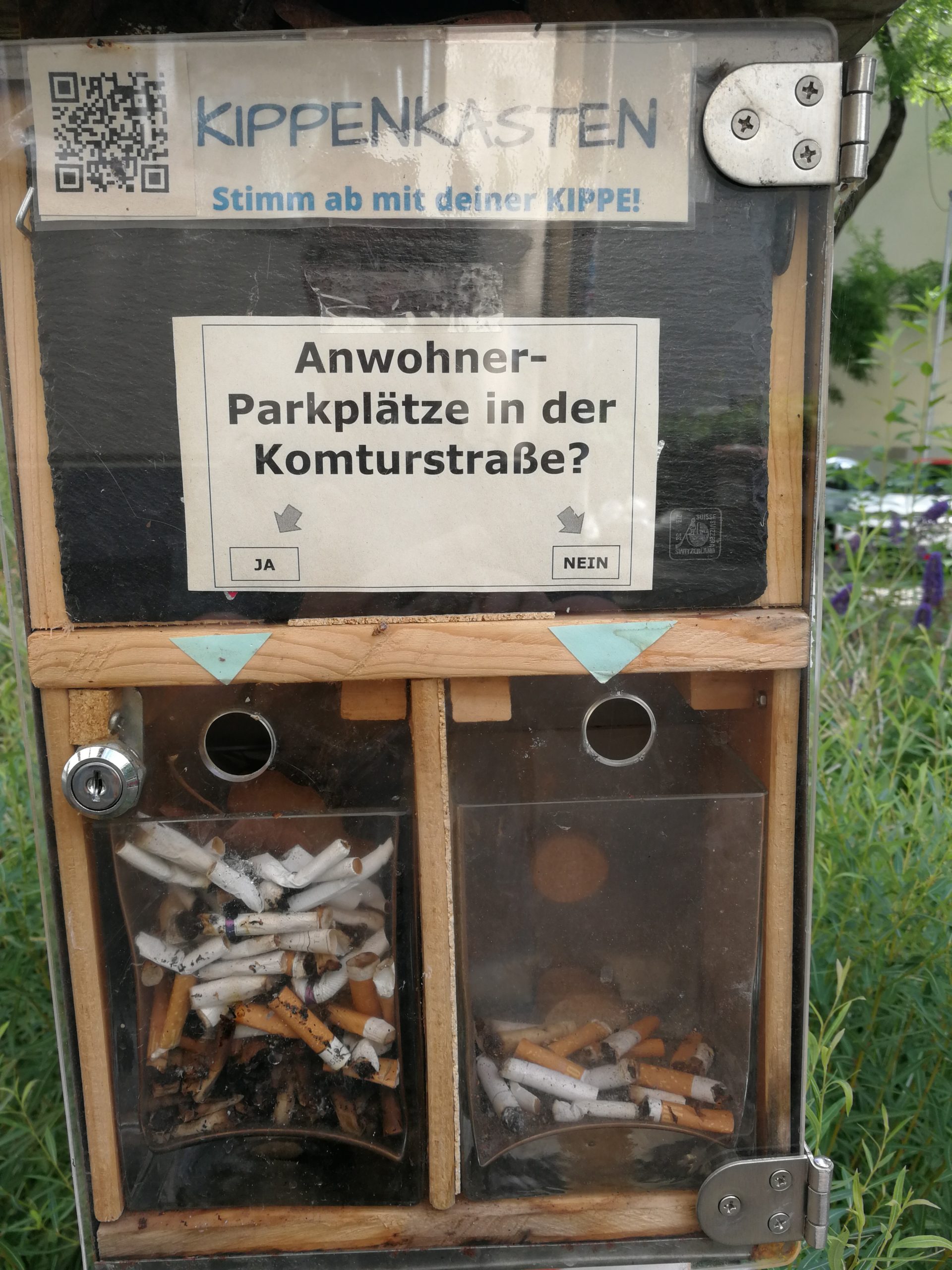 Am Brett haben wir noch auf ca. 1,2 m Höhe ein Holz angebracht, damit die Raucher ihre Kippe auch ausdrücken können, bevor sie durch den Einwurf abstimmen.
