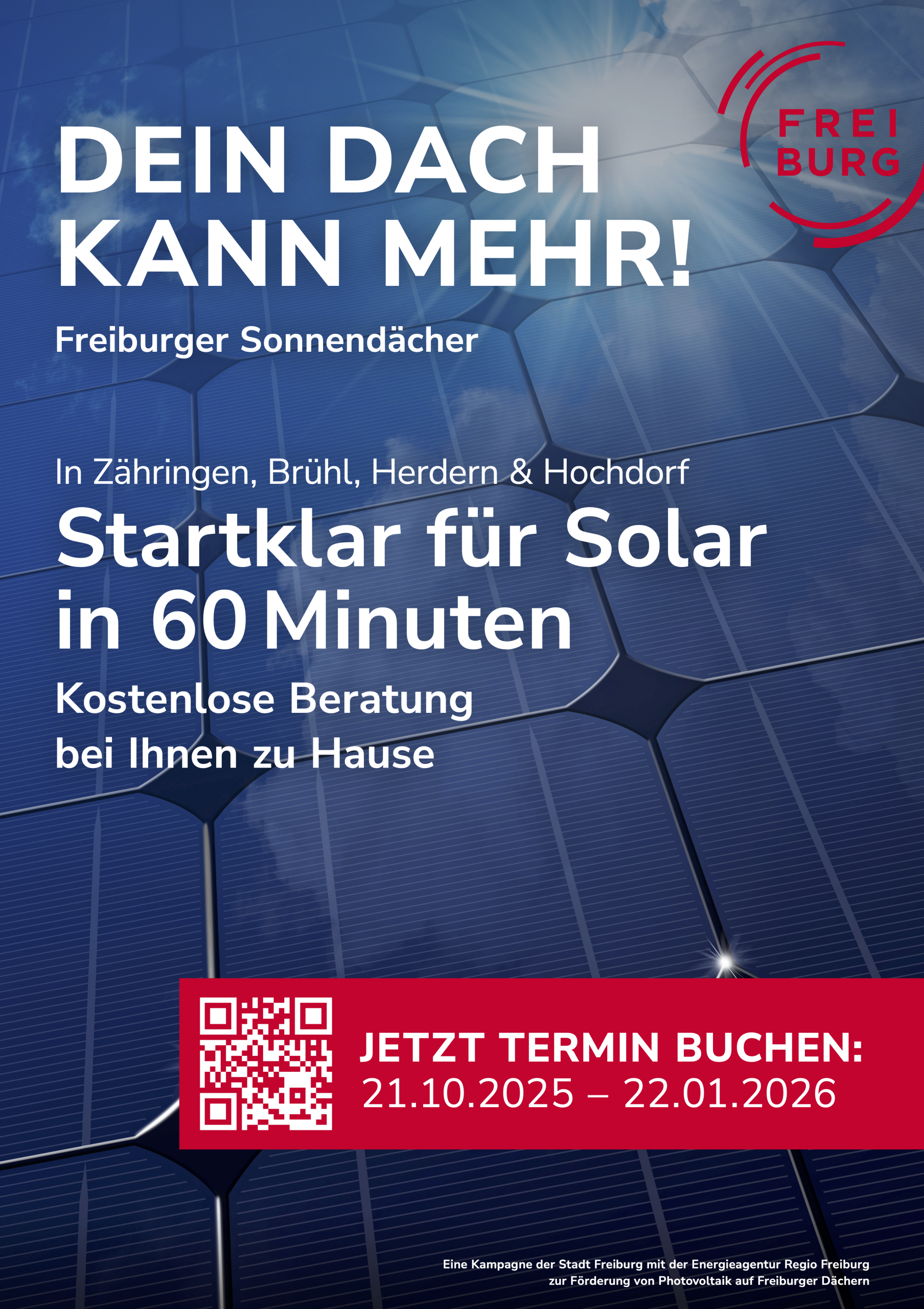 Die Energieagentur Regio Freiburg berät im Auftrag der Stadt die Bürger*innen aus Zähringen, Brühl, Herdern und Hochdorf zum Thema Solar. Die Beratung ist unabhängig.