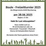 - Boule – Freizeitturnier 28.06.2025Am 28.06.2025 veranstaltet der Bürgerverein Brühl-Beurbarung auch dieses Jahr wieder ein Boule-Freizeitturnier. Eingeladen sind alle, die Spaß am Spiel haben und ohne verbissenen Ehrgeiz auskommen. Es spielen max. 8 Teams mit 2-3 Personen. Einzelpersonen können mit anderen ein Team bilden. Es wird nach vereinfachten Regeln gespielt (s. Flyer „BVBB_Flyer_Bouleturnier 2025_Regeln“.) Wie schon im letzten Jahr … Weiterlesen