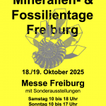 - Mineralien- und Fossilientage FreiburgAuf der Freiburger Messe finden am kommenden Wochenende die Internationale Mineralien- und Fossilientage Freiburg statt. Geöffnet sind die Ausstellungen am Samstag, 18. Oktober 2025 von 10-18 Uhr und am Sonntag, 19. Oktober 2025 von 10-17 Uhr.
