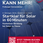 - Kostenlose SolarberatungDie Energieagentur Regio Freiburg berät im Auftrag der Stadt die Bürger*innen aus Zähringen, Brühl, Herdern und Hochdorf zum Thema Solar. Die Beratung ist unabhängig. Voraussetzung: Das betreffende Gebäude muss sich in den Stadtteilen Zähringen, Brühl, Herdern oder Hochdorf befinden. Beratungszeitraum: 21. Oktober 2025 bis 22. Januar 2026 Wichtig: Wenn Sie Teil einer Wohnungseigentümergemeinschaft (WEG) sind, … Weiterlesen