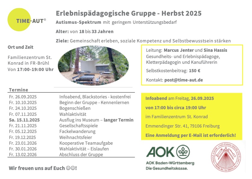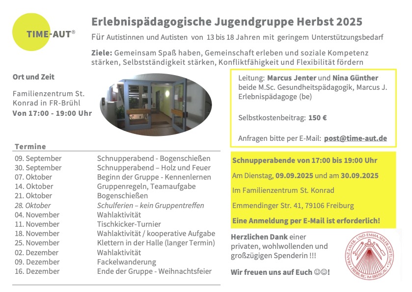 Für Jugendliche gibt es regelmäßig Gruppenangebote im Familienzentrum St. Konrad in Freiburg-Brühl. Noch bis Ende Oktober 2025 ist ein kostenfreies Schnuppern möglich. Interessierte Eltern oder Bezugspersonen melden sich bitte per E-Mail an: post@time-aut.de